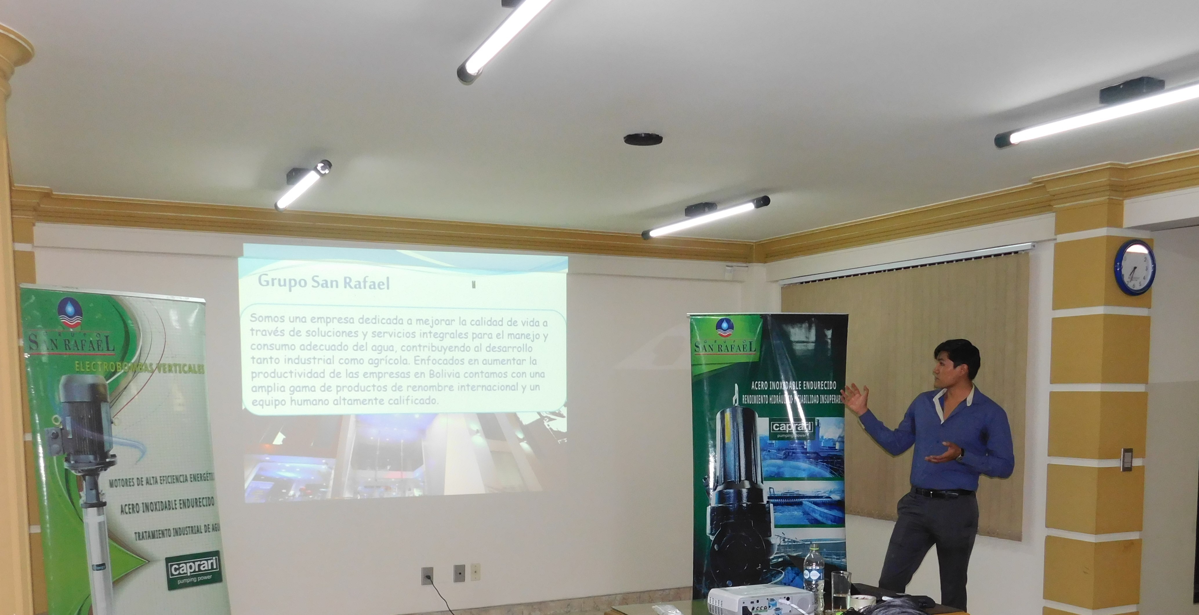 El martes 24 de octubre, el Grupo San Rafael, conto con la presencia de Fabrizio Storti, representante de la fabrica Pedrollo Italia, quien dio un seminario taller a los miembros de la empresa, miembros de constructoras y personal de la industria en Bolivia, seminario que estuvo enfocado en la instalación de bombas de agua de gran capacidad. Este evento se llevo a cabo en la Camara Departamental de Construcción de Cochabamba..